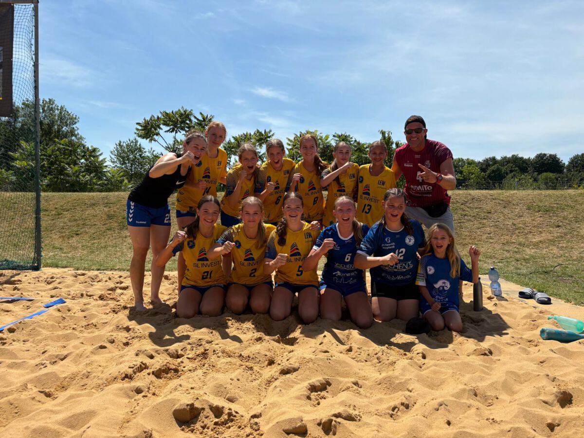 Kaum zwei Wochen später ging es zum Beachturnier nach Königsbrunn. Hier gelang es den beiden C-Jugend-Mannschaften einen 5. und einen 9. Platz zu belegen. Da kurzfristig vor Turnierbeginn noch fünf Mädels erkrankt oder abgesprungen waren, verschmolzen die beiden SMÜ-Teams im Turnierverlauf zunehmend zu einer einzigen Mannschaft, die doppelt spielte. Trotz der Hitze und der anstrengenden Spiele verzeichneten die Mädels genau wie in Taufers eine steile Lernkurve und am zweiten Tag gingen die Teams aus jeder einzelnen Begegnung siegreich hervor. Mit nur zwei Beach-Einheiten vor Beginn des Turniers aufgrund des durch Bauarbeiten gesperrten Beachplatzes, kann sich das Ergebnis des Turniers daher durchaus sehen lassen. Besonders freute sich das Trainergespann über den im Turnierverlauf ständig steigenden Spielwitz und das schnelle Umschaltspiel seiner Mädchen, mit denen sie immer wieder kreativ ihre Gegnerinnen vor neue Herausforderungen stellten. Erwähnenswert ist vielleicht auch, dass sich jede einzelne Spielerin an diesem Wochenende in die Torschützinnenliste eintrug, und in diesem Sinne gilt es auch, das Torwartspiel hervorzuheben: Sophia perfektionierte im Laufe des Wochenendes den langen Wurf aufs leere Tor und konnte so immer wieder einfache 2 Punkte für ihr Team beisteuern. Auch die neu gekürten Torhüterinnen Clara, Lotta und Lia zeigten ein Händchen für das Erzielen von Torwarttoren und so war man nicht nur vorne, sondern auch von hinten raus sehr erfolgreich.