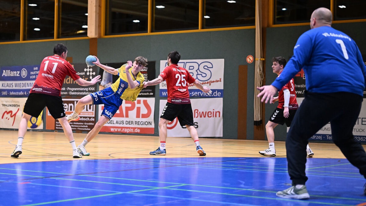Diese Motivation war den Jungs um Trainer Astalosch von Beginn der Partie anzumerken. SMÜ hat den ersten Angriff. Erster Spielzug, Scholz bereitet vor, Labermeier mit Wille und Entschlossenheit in die Lücke, Tor! Diese erste Führung ließen die Gäste zunächst nicht Bestand halten und drehten die Partie zum ersten und einzigen Mal. Dann jedoch stabilisierte sich der gelb-blaue Abwehrverbund vor Torhüter Seidler. Früh durchschaute der Schwabmünchner Trainer die angereiste Truppe aus Günzburg, welche immer wieder den Erfolg über die Außen oder das Auflösen auf zwei Kreisläufer forcierte. Durch den Übergang von der offensiveren 3:2:1 Abwehr zur 6:0 bekam man die Offensivbemühungen der Gäste so immer besser in der Griff und erzwang Abschlüsse aus schlechten Positionen mit Paraden oder gar direkte Ballgewinne. Offensiv angetrieben von den stark aufspielenden Dominik Schikor und Felix Hänsel, defensiv gestützt von einem stark kämpfenden Sebastian Schüller erspielte man sich einen Acht-Tore-Vorsprung in der 23. Spielminute. Halbzeitstand 18:12.